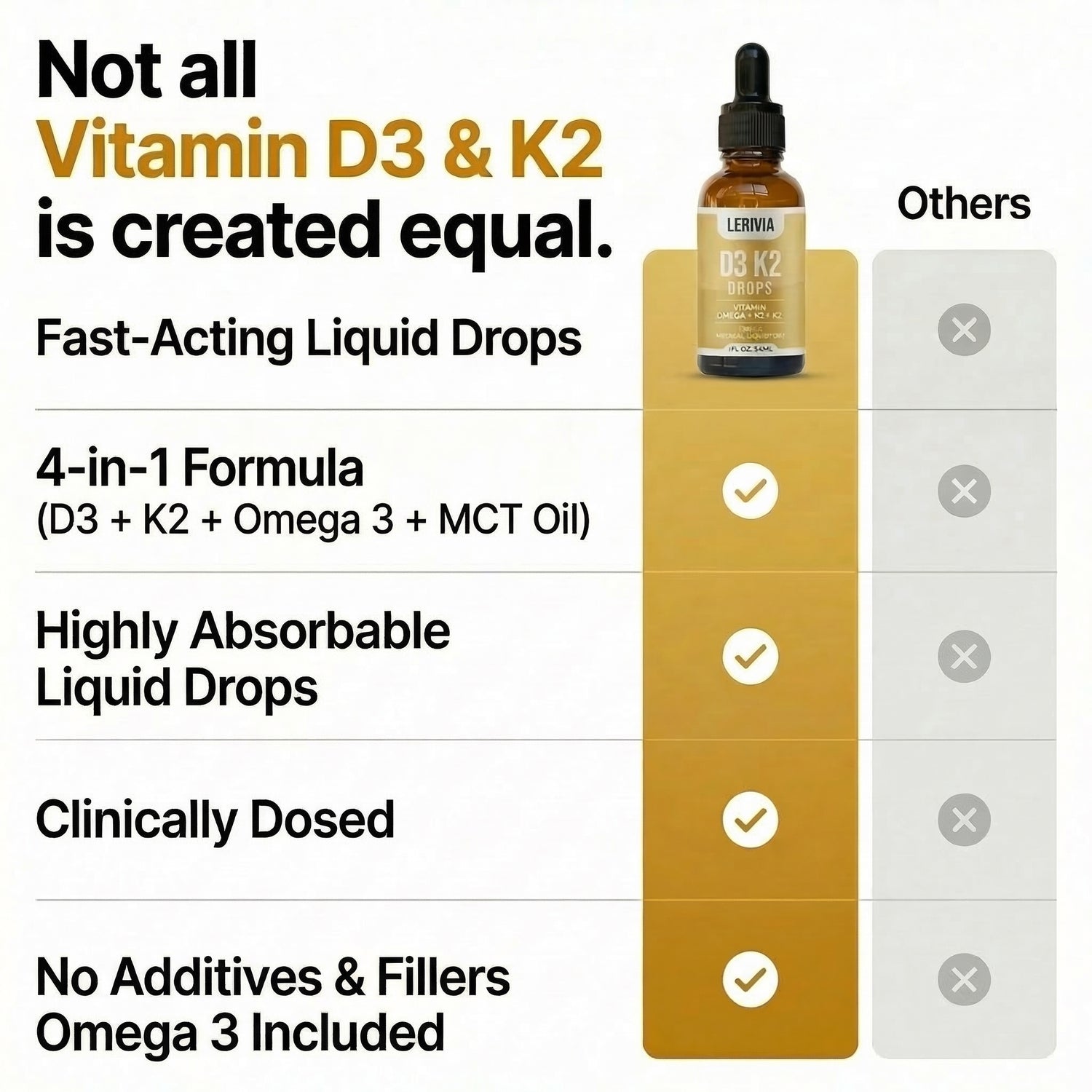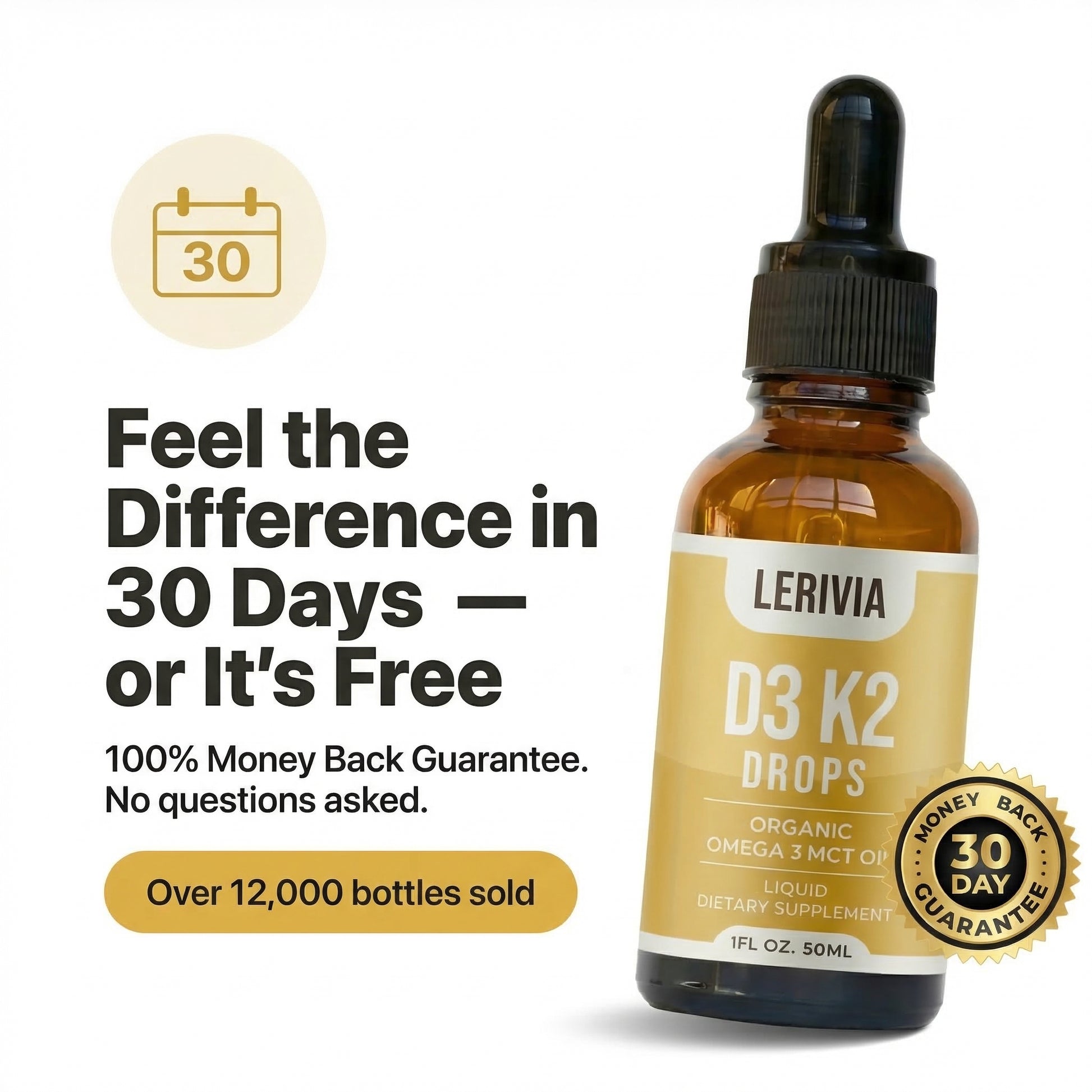 Unlike tablets that aren't absorbed properly and can leave calcium in the wrong places, Lerivia Vitamin D3 + K2 Liquid Drops are clinically formulated to work where your body needs it most.